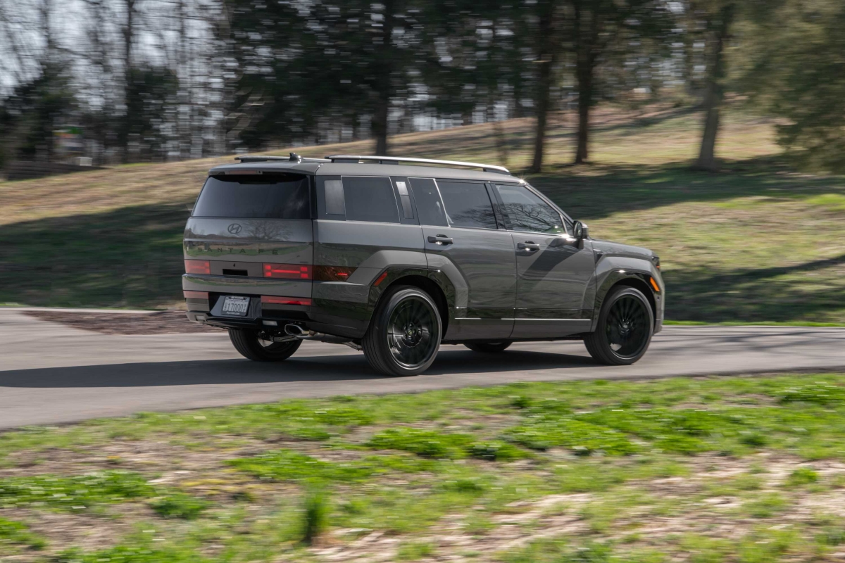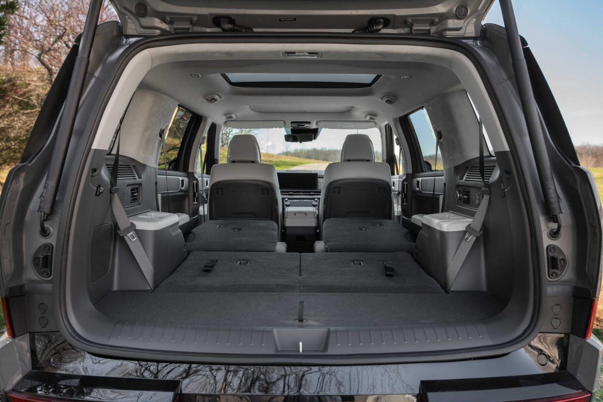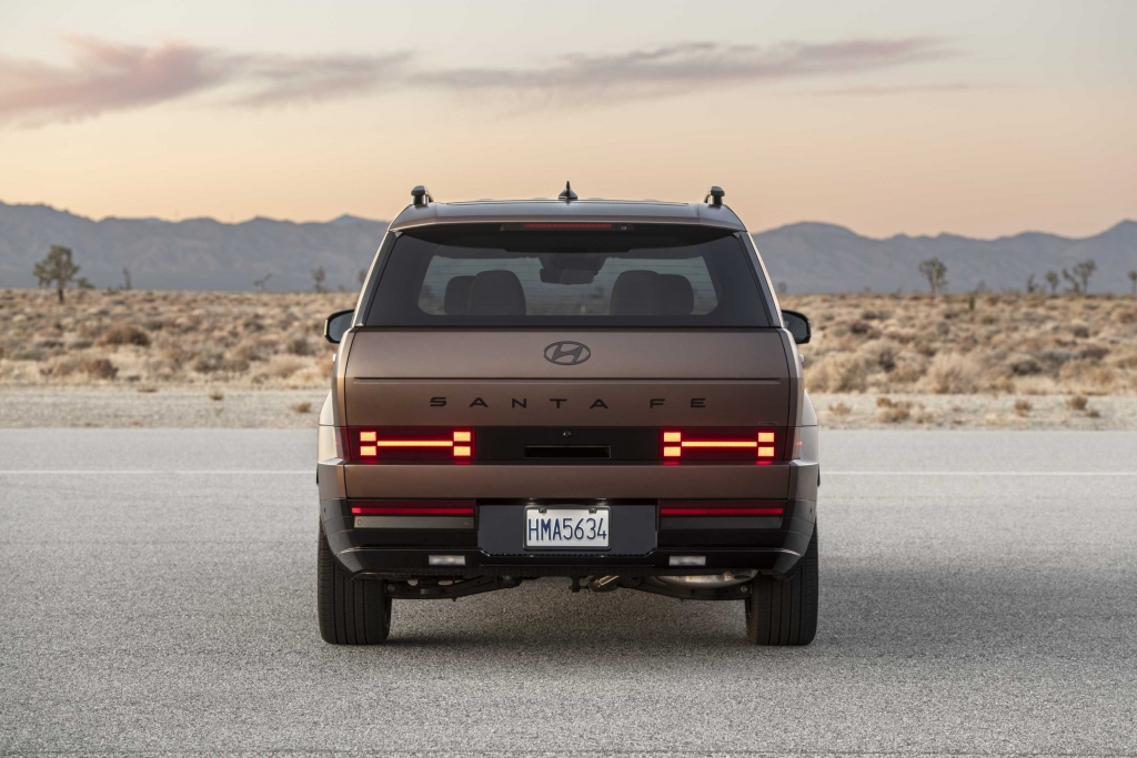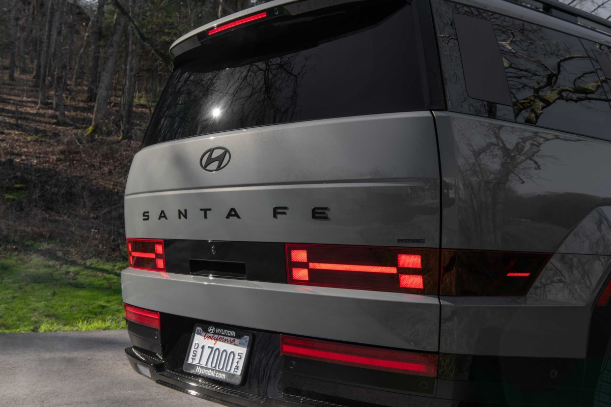 A traseira do Hyundai Santa Fe destaca-se pelo design irreverente, com linhas limpas e um toque marcadamente nipónico, que pode gerar alguma estranheza, mas também surpreender pela originalidade. A porta traseira alargada não apenas contribui para o estilo único, mas também oferece um acesso amplo à bagageira, ideal para atividades ao ar livre. Com o portão traseiro aberto, o espaço pode ser aproveitado como assento, oferecendo mais comodidade em passeios familiares fora de estrada.