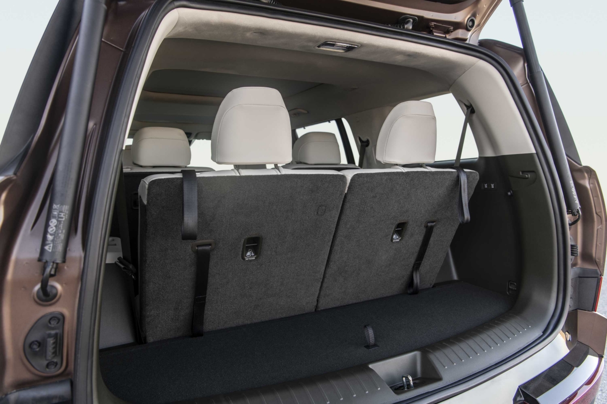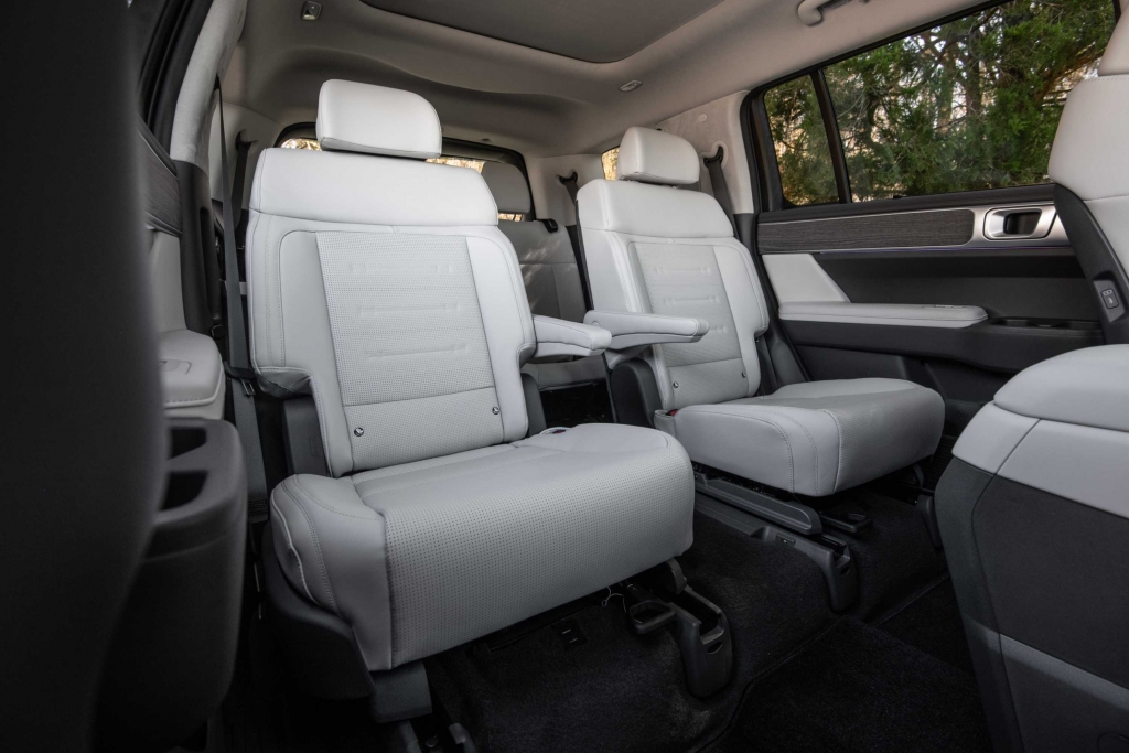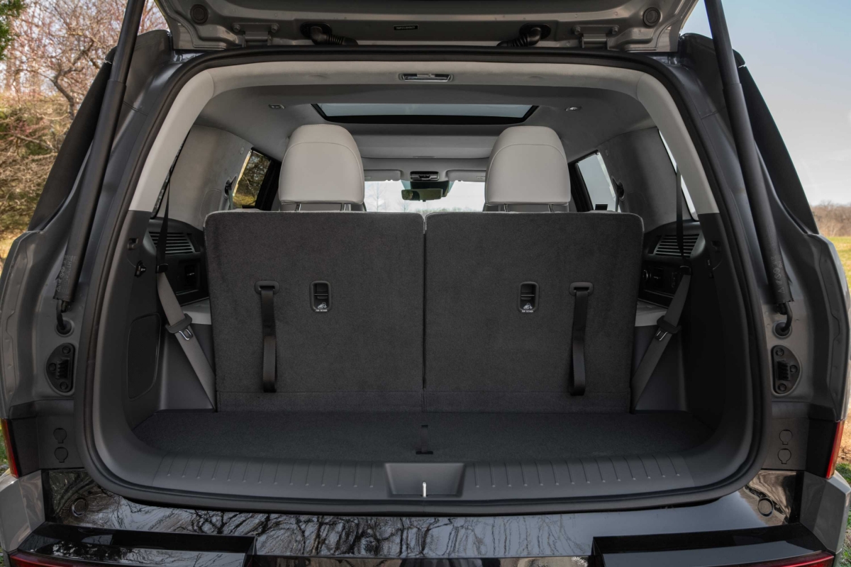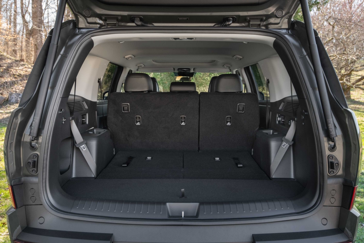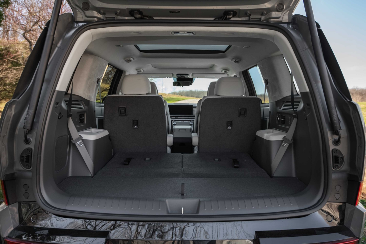 A traseira do Hyundai Santa Fe destaca-se pelo design irreverente, com linhas limpas e um toque marcadamente nipónico, que pode gerar alguma estranheza, mas também surpreender pela originalidade. A porta traseira alargada não apenas contribui para o estilo único, mas também oferece um acesso amplo à bagageira, ideal para atividades ao ar livre. Com o portão traseiro aberto, o espaço pode ser aproveitado como assento, oferecendo mais comodidade em passeios familiares fora de estrada.