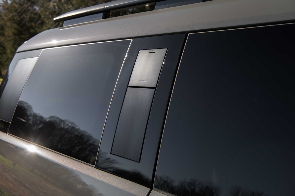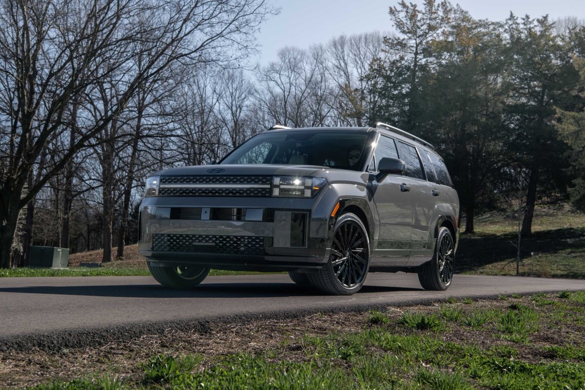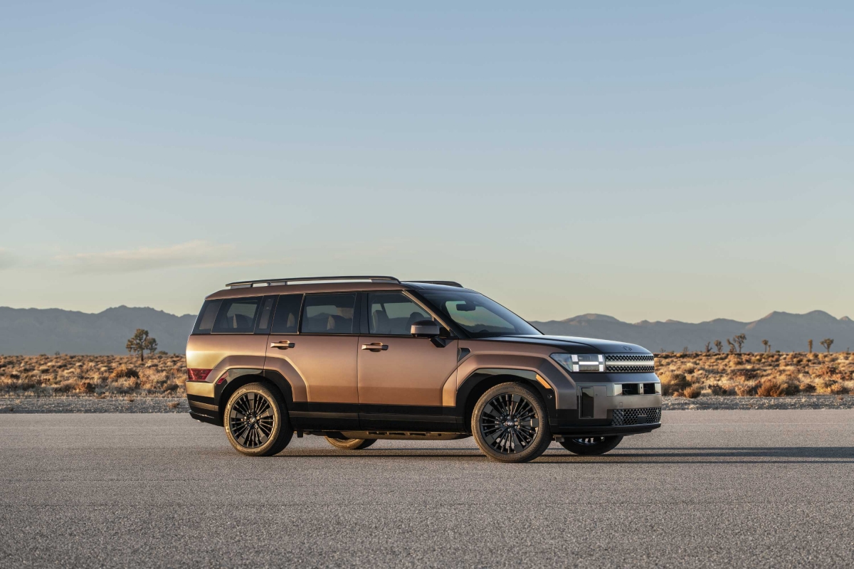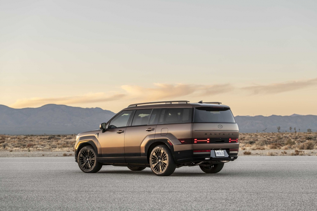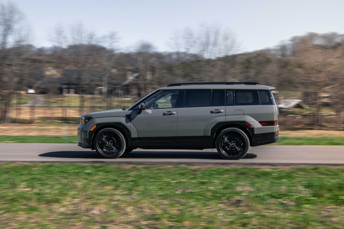 O perfil lateral do Hyundai Santa Fe evidencia as linhas direitas e a dimensão generosa do SUV, com 4,83 metros de comprimento e uma altura ao solo de 1,77 metros. A maior distância entre eixos garante um interior espaçoso para até sete passageiros. O design combina um tejadilho longo e cavas das rodas robustas, que acomodam pneus com jantes imponentes de 20 polegadas. Esta abordagem transmite uma sensação de grandeza e versatilidade, reforçando a presença marcante do modelo.