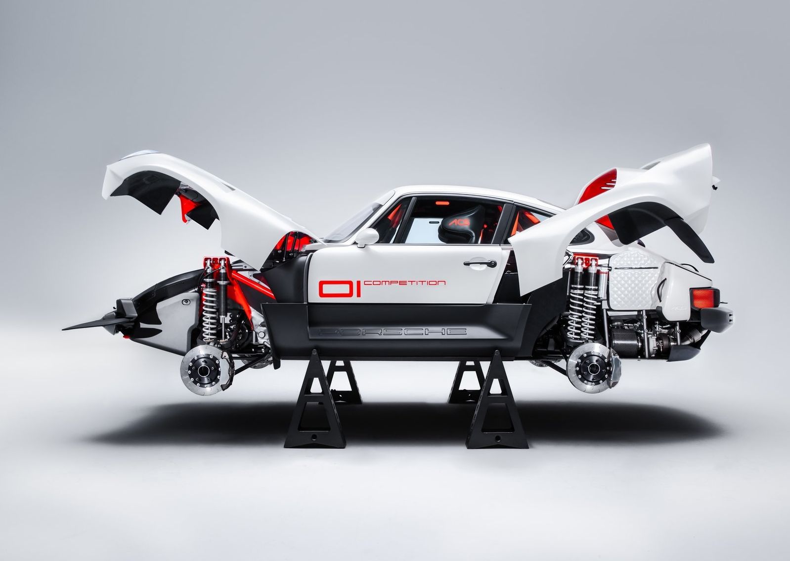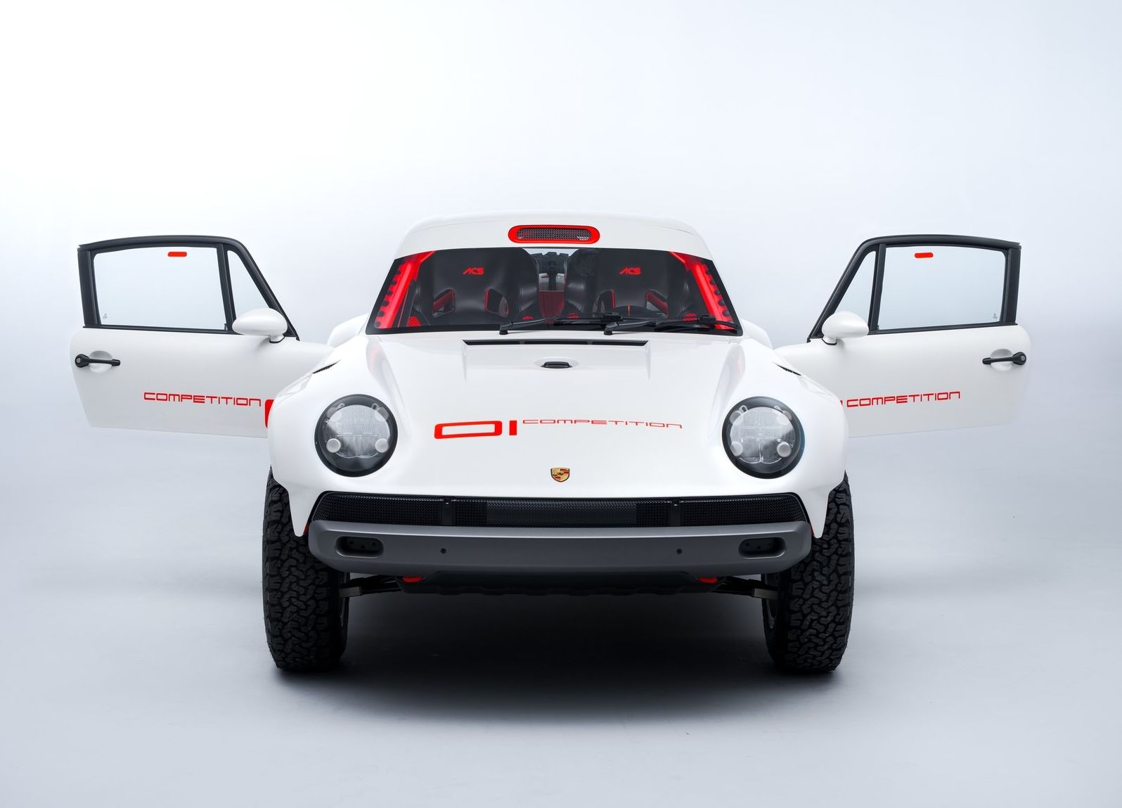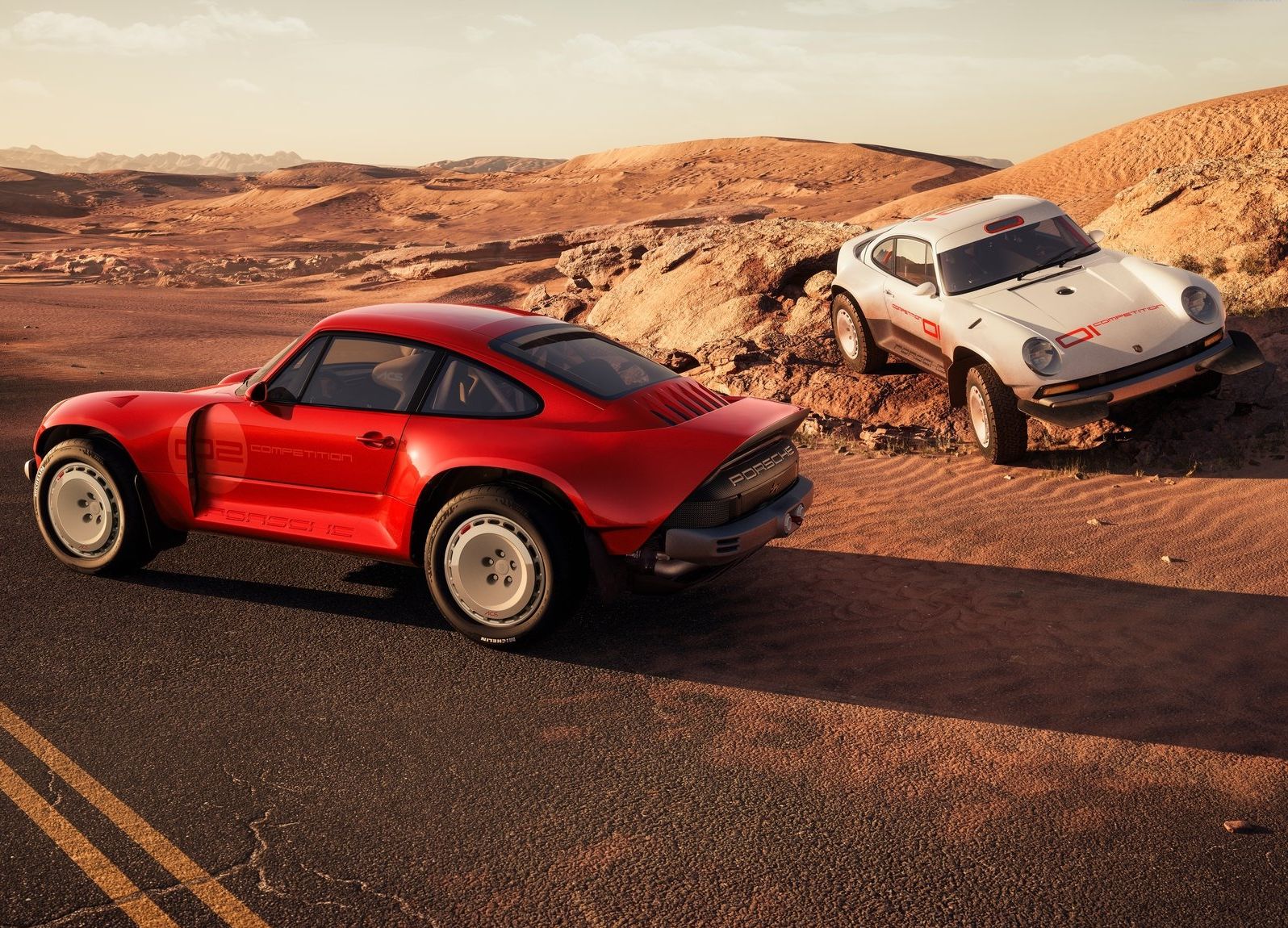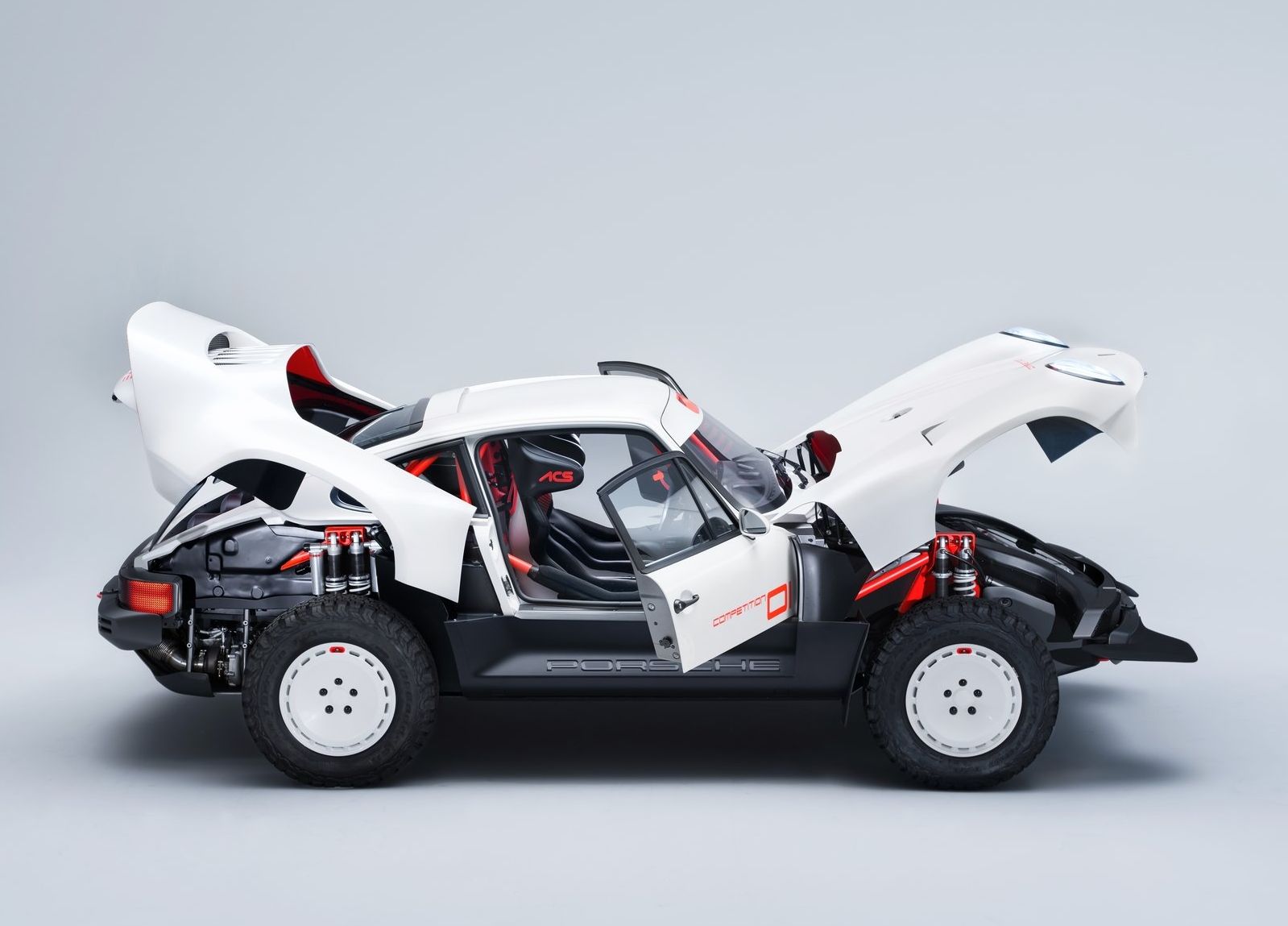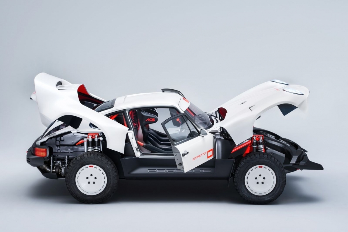 Mas, indo mais longe, o cliente não pediu apenas um, mas sim dois exemplares deste All-terrain Competition Study (ACS), um em branco (na cor tradicional da Singer Parallax White) pensado para ralis de terra ou areia e outro em vermelho, pintado na cor Corsica Red, para competições de asfalto.