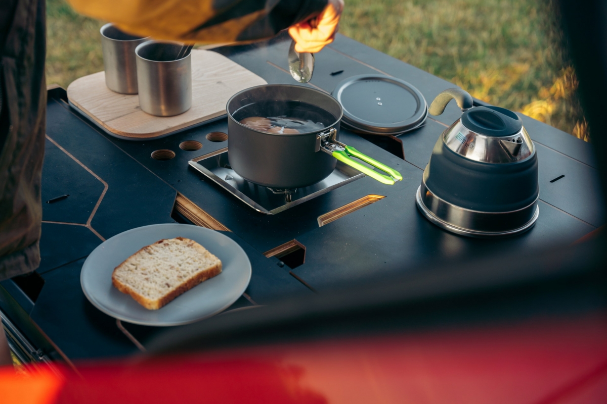 Ainda assim, o destaque vai para o módulo de campismo configurado à medida da mala do Skoda Enyaq (585 litros), numa plataforma deslizante com fogão a gás, lavatório e arrumação.