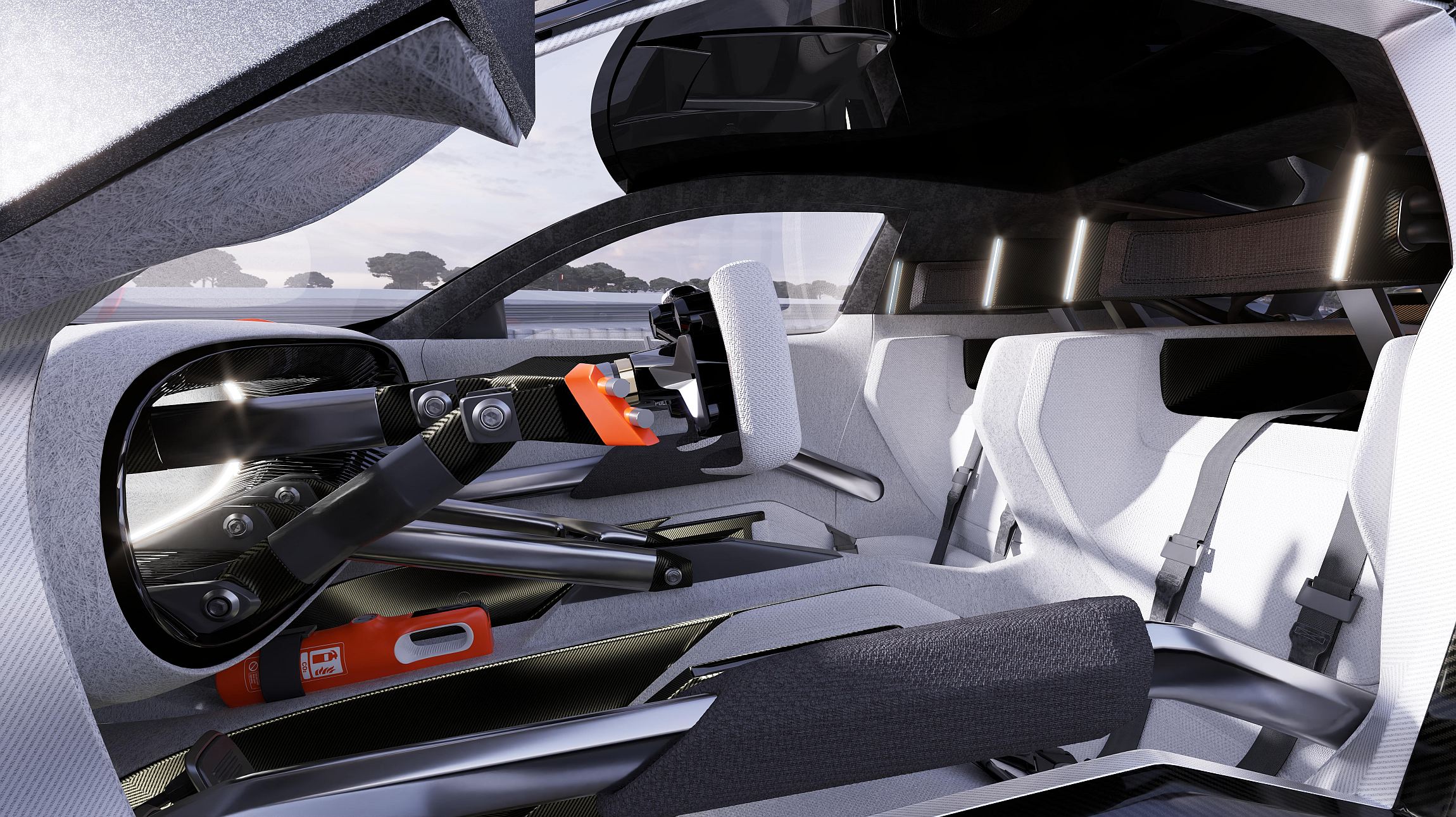 Uma vez no interior, ficam claramente à vista as inspirações nos videojogos e na competição, como por exemplo através das laterais bastante elevadas através das quais o condutor e passageiro ‘trepam’ para os bancos, tipicamente de corrida, com cintos de segurança de seis pontos. O acabamento em branco sobressai para um visual muito especial, assim como os encostos de cabeça mais amplos.