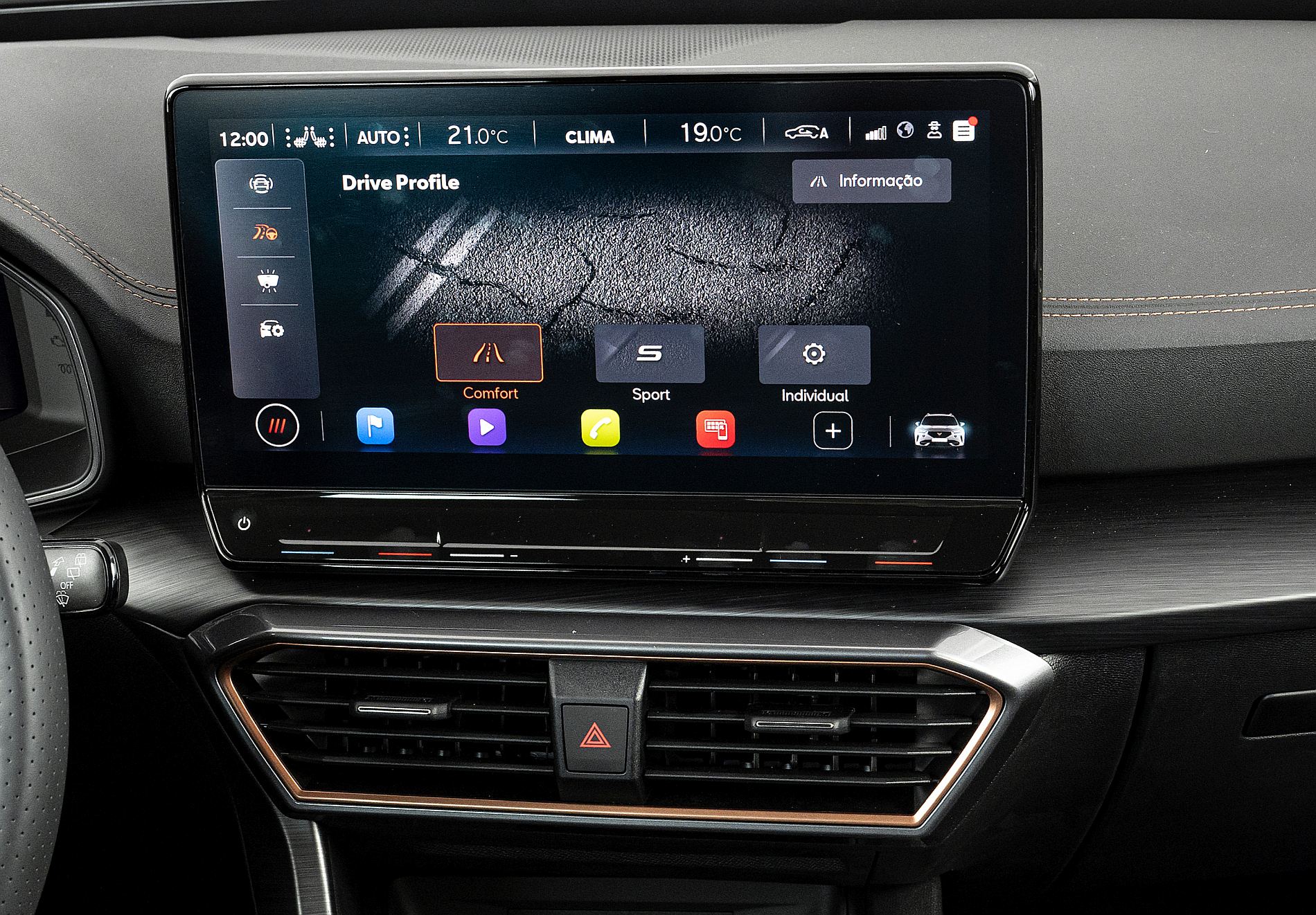 O sistema de infoentretenimento Plus com ecrã de 12” (opcional, uma vez que o ecrã de série é de 10″) também é simples de ler em andamento, congregando a grande maioria das funções do Formentor, incluindo a climatização, numa solução que não é brilhante, mas que serve o propósito de ‘limpar’ o tablier de demasiados botões e comandos. Ainda assim, há quatro teclas táteis de atalho pouco abaixo do ecrã central, permitindo então aceder diretamente a parâmetros como os modos de condução, o sistema de estacionamento ou a climatização.