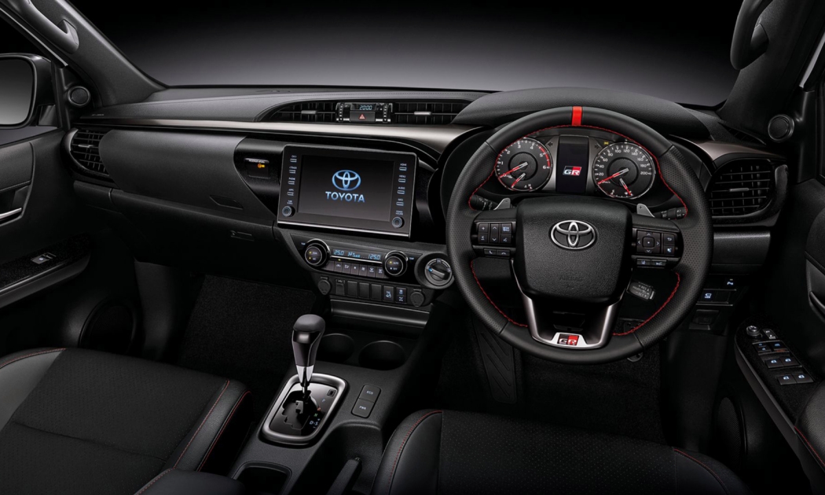 A Toyota Hilux GR Sport, que está apenas disponível nalguns mercados asiáticos, nas duas configurações Hi-Floor (com altura ao solo normal) e Lo-Floor (mais próxima do asfalto), apresenta também as decorações com as cores da Gazoo Racing, num pacote de personalização que inclui pinças de travão dianteiras pintadas a vermelho com a insígnia GR (que está também no volante forrado a couro de qualidade com costuras na mesma cor), pedaleira em alumínio e quadro de instrumentos específico.