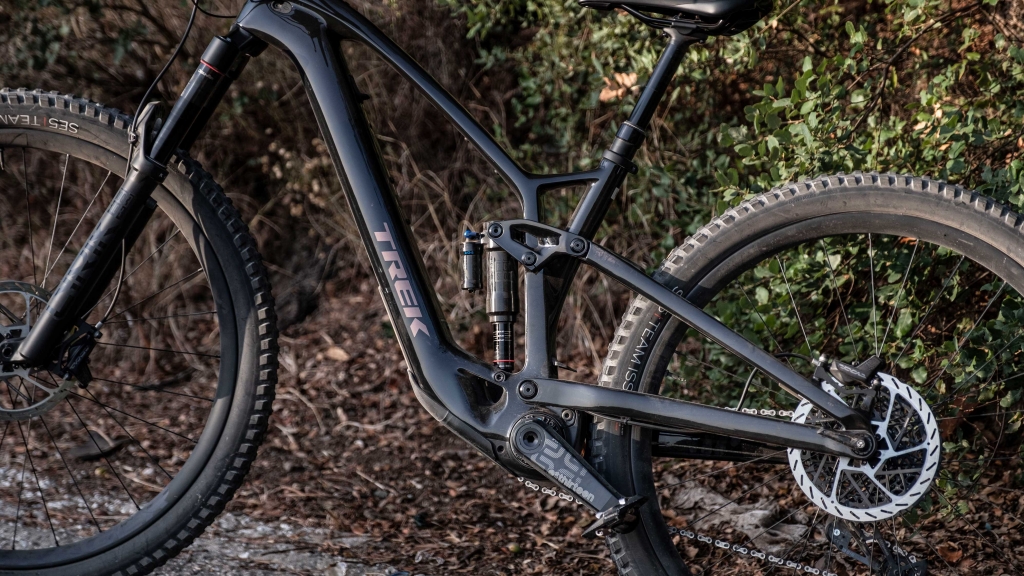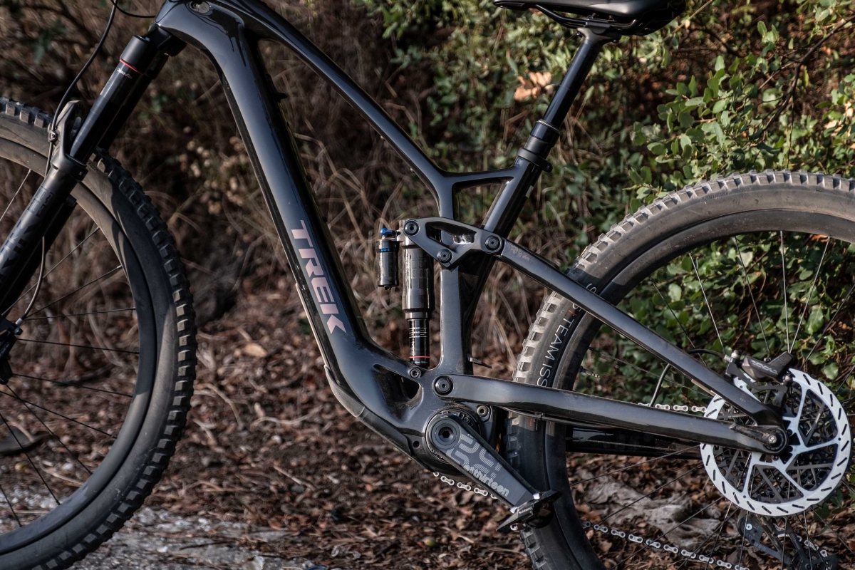 O quadro é baseado na última geração da Trek Fuel EX não eletrificada, e disponibiliza 140 mm de curso na roda traseira, graças ao sistema de suspensão ABP, patenteado da marca. No tamanho M, por nós testado, medimos um alcance de 453 mm, com 64.8° no ângulo de direção, e 76.8° de inclinação no tubo do selim. As medidas foram obtidas com o dispositivo que permite alterar a geometria (Mino Link), na posição baixa. Desta forma é também possível utilizar uma roda na traseira com tamanho 27,5”.