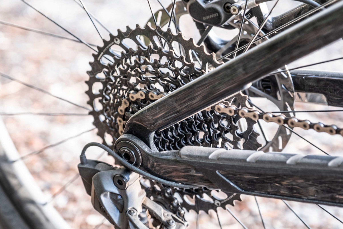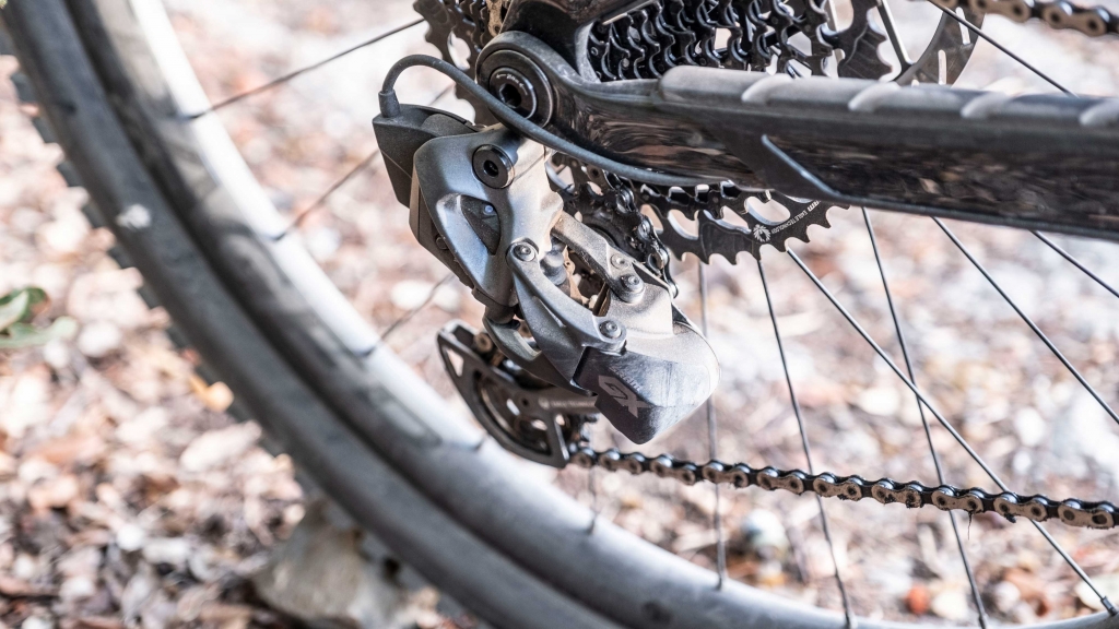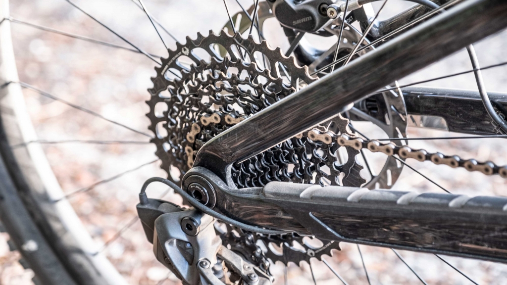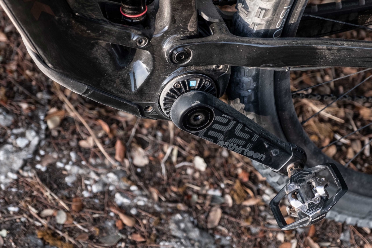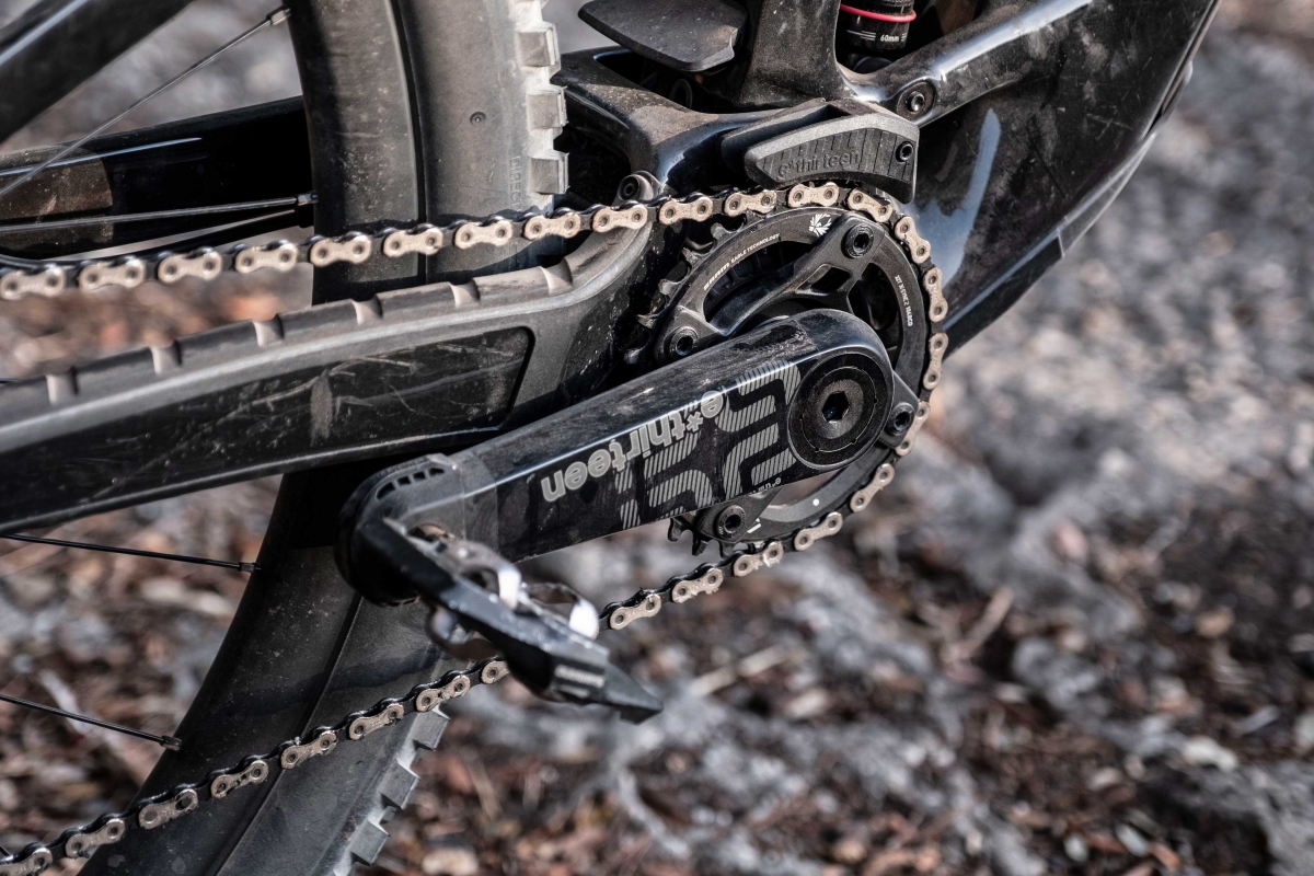 A transmissão sem fios XX1 Eagle AXS é fornecida pela SRAM, e os cranks da pedaleira são e*thirteen. A mudança traseira responde finalmente à nossa pergunta: “porque é que tem uma bateria própria, em vez de ser alimentado pela bateria da própria bicicleta?”. A SRAM finalmente resolveu este pormenor, também para o espigão de selim hidráulico sem fios Reverb AXS, o que significa que já não precisamos de nos preocupar em verificar a carga de cada umas das baterias antes de sair de casa.