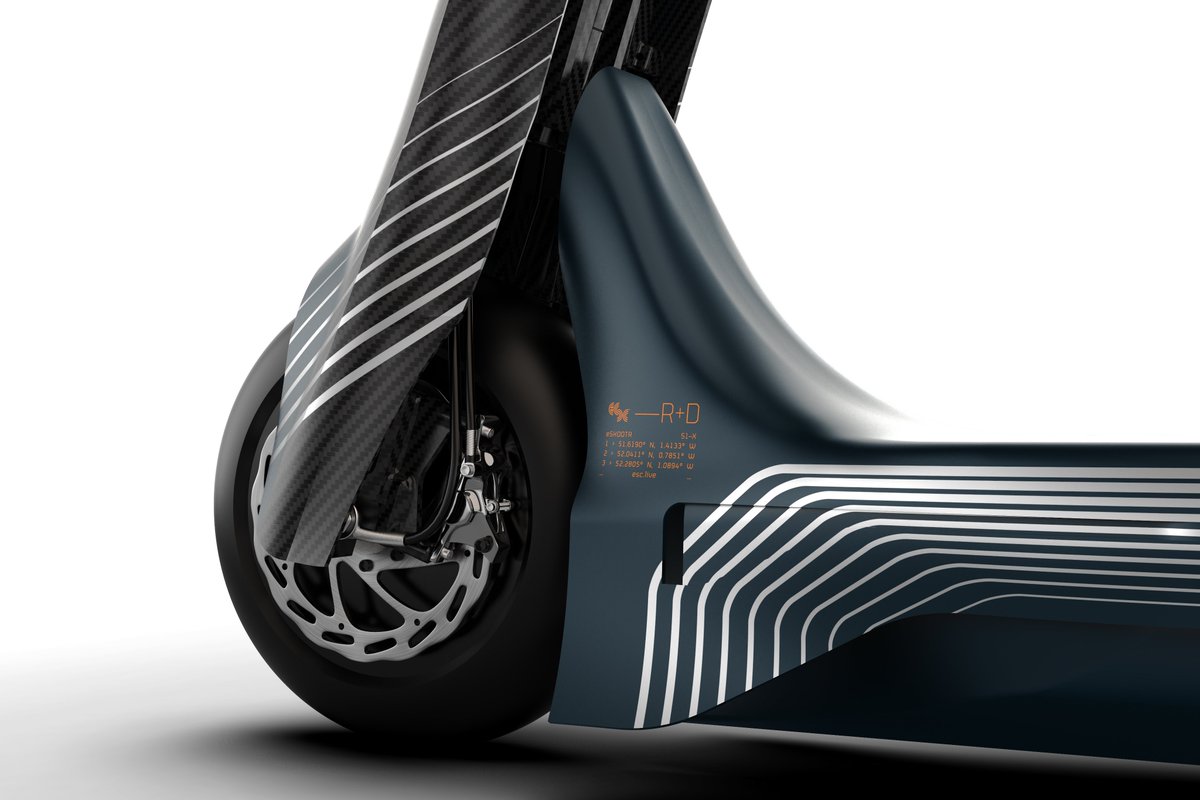 Com chassis especial fabricado em fibra de carbono e alumínio, a trotinete não ultrapassa os 35 kg de peso e monta rodas especiais de 6,5 polegadas para ótima estabilidade em curva. A eSC garante que o modelo pode inclinar-se a 50 graus, se o piloto for suficientemente corajoso…