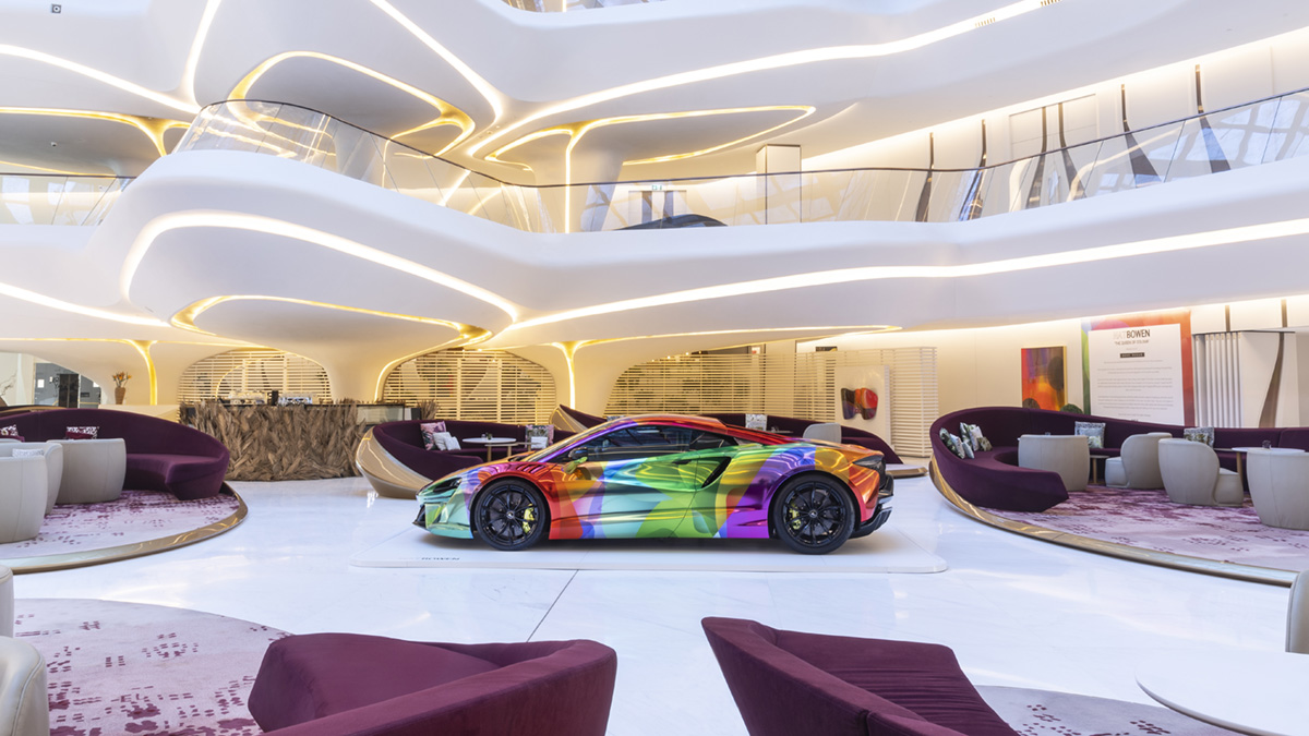 Não que o McLaren Artura, primeiro supercarro híbrido de alta performance de produção em série, com uma motorização híbrida capaz de entregar 680 CV de potência e só com 1498 kg de peso, precise de mais para dar nas vistas. Mas este é especial e único, personalizado pela artista britânica de abstrato, Nat Bowen.