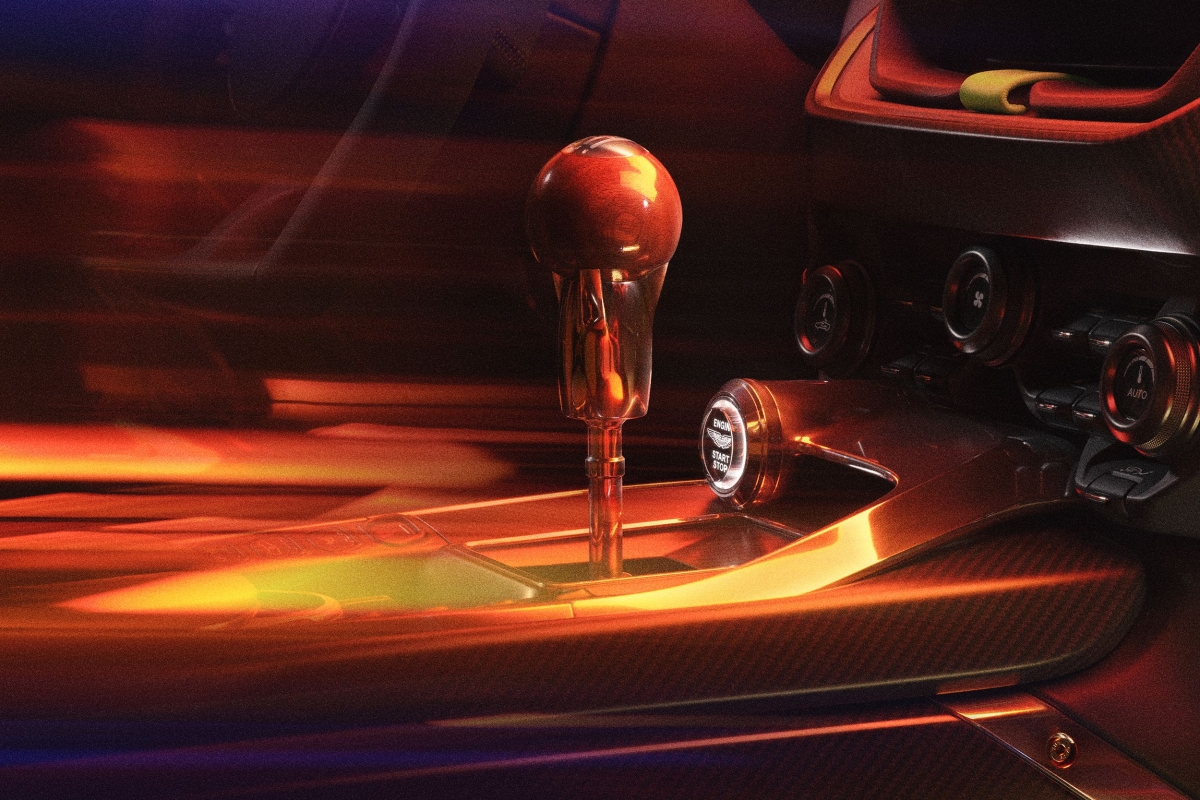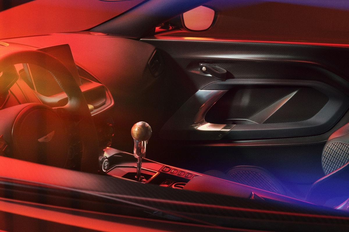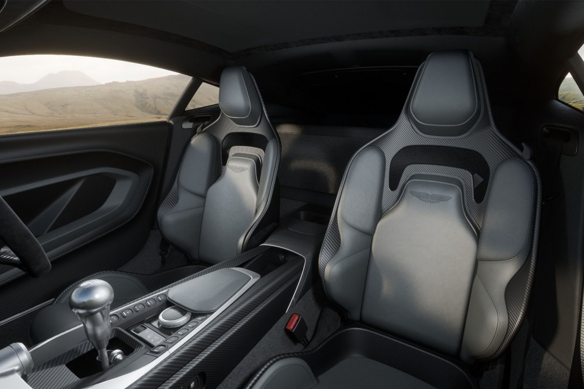 No interior, a mesma inspiração clássica na apresentação e nos revestimentos em lã de tweed, que eram usados também no DBR1 que venceu Le Mans, em 1959. A fibra de carbono é outro material em abundância no cockpit, que está equipado com bacquets modernas. Em posição sobrelevada na consola central, o seletor da caixa de velocidades, que é manual, com seis relações, desenvolvida especificamente para este coupé.