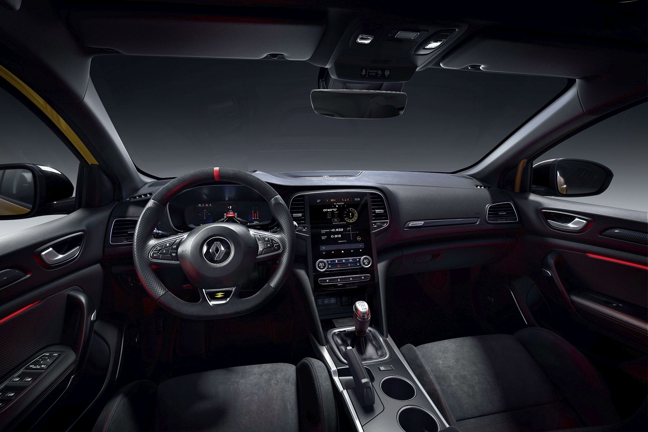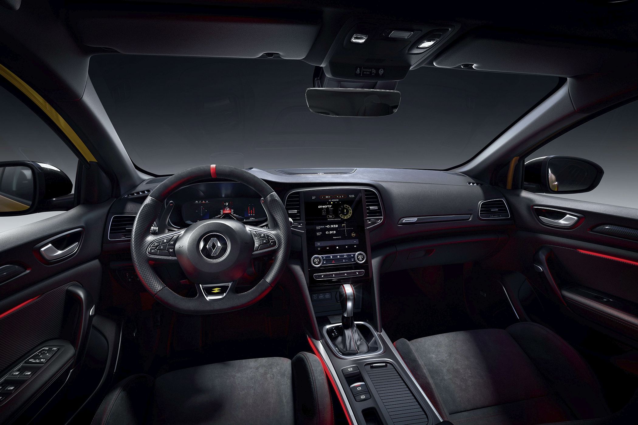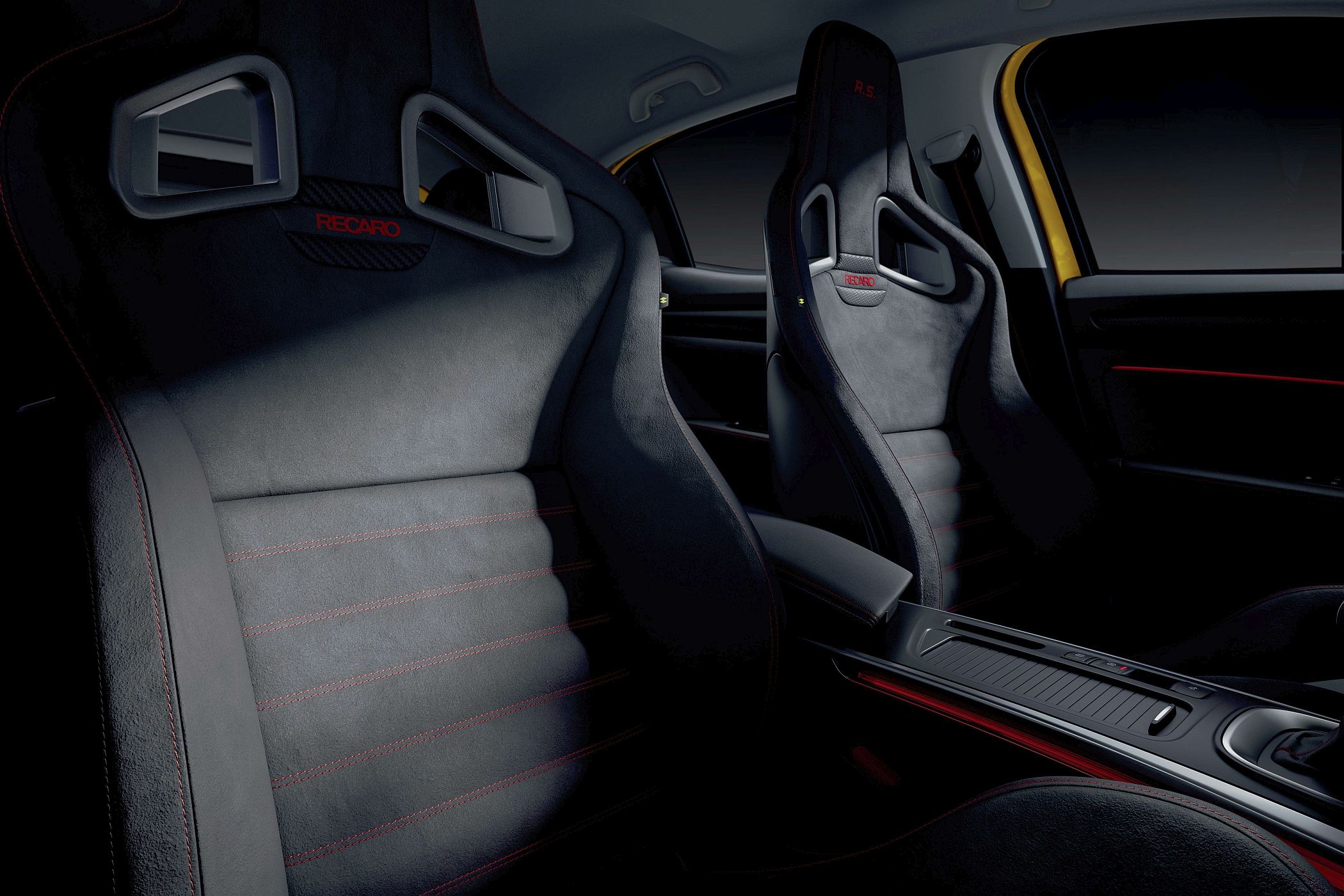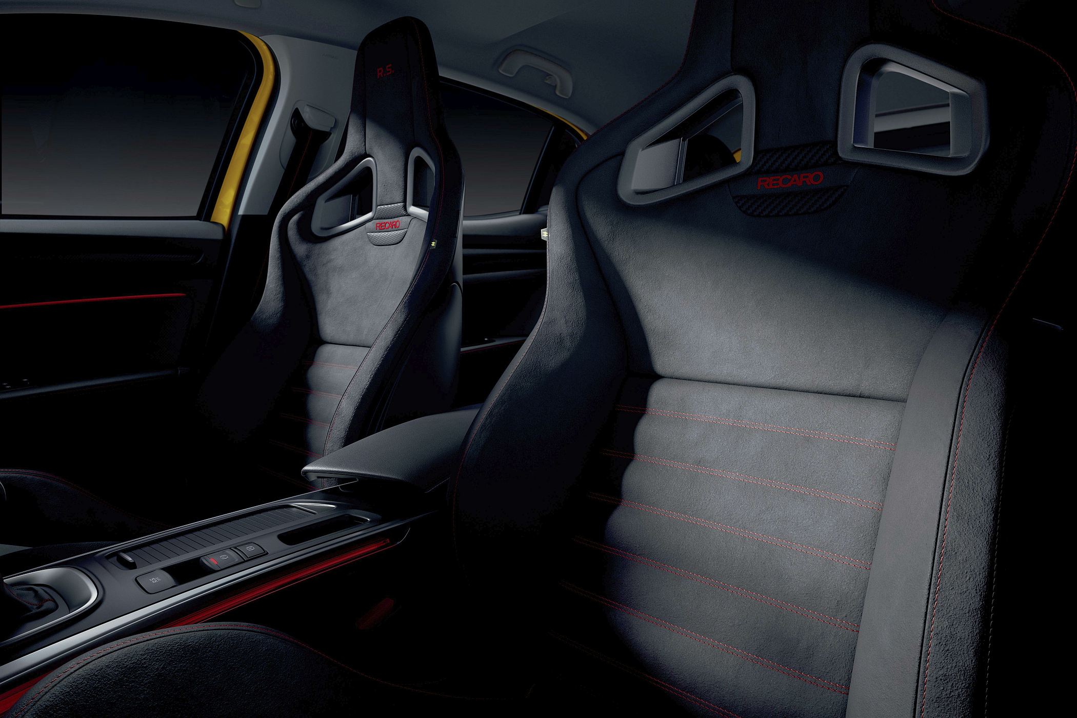 No interior, o equipamento de série inclui os bancos tipo baquet da Recaro, com estofos em Alcantara no tom preto titânio e com o monograma R.S. bordado. O cartão mãos-livres Megane R.S. Ultime recria o padrão diamantado das riscas. As soleiras das portas são exclusivas e cada modelo tem a sua própria placa metálica numerada perto dos comandos da transmissão, na parte inferior da consola.
