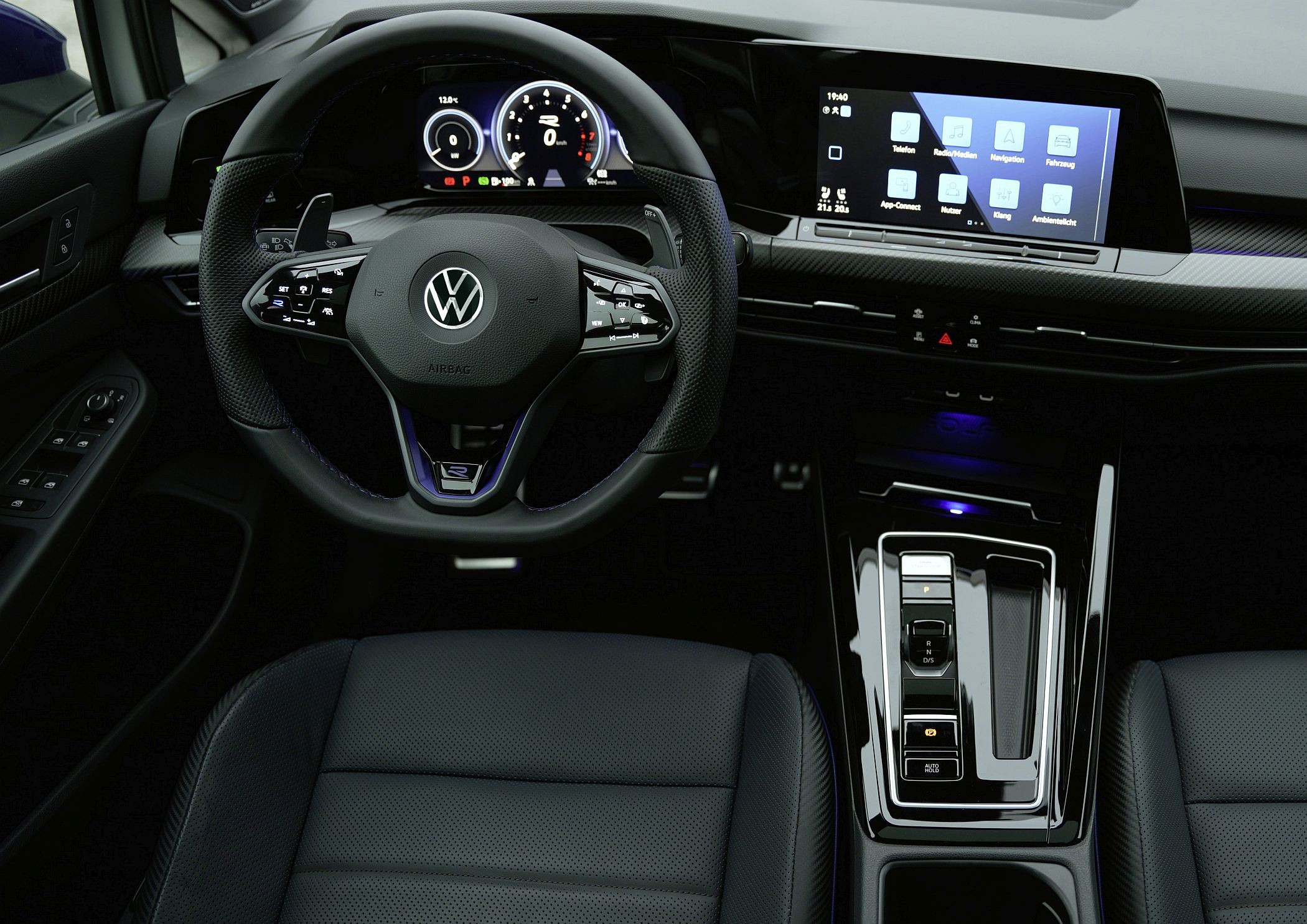 O interior destaca-se pela opção em Carbono Genuíno, com o tablier e os painéis das portas com elementos decorativos em carbono de série, sendo uma novidade absoluta em qualquer Volkswagen. Além disso, conta ainda com diversos elementos específicos, como os logótipos ‘R’ em azul, o volante desportivo também com insígnia ‘R’ ou na capa da chave. O modelo dispõe ainda de bancos desportivos dianteiros com revestimentos em ‘napa’-carbono de série com climatização e regulação elétrica.