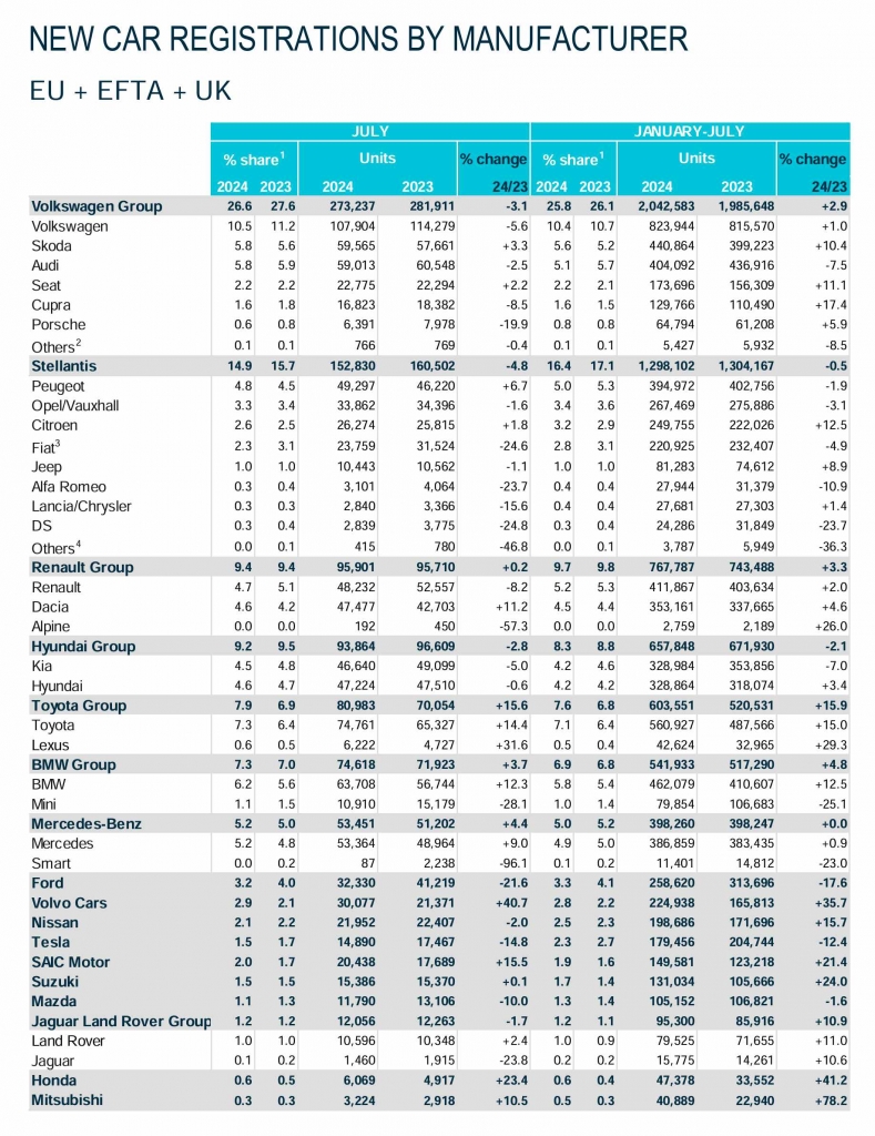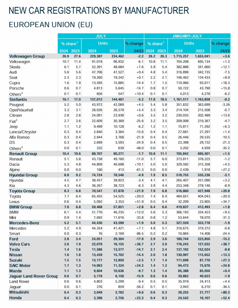 Segundo o relatório da Associação Europeia de Fabricantes de Automóveis (ACEA) de julho de 2024, os registos de automóveis novos na UE tiveram um aumento modesto (+0,2%) com resultados mistos nos quatro principais mercados da região: A Itália (+4,7%) e a Espanha (+3,4%) registaram ganhos moderados, enquanto os mercados francês (-2,3%) e alemão (-2,1%) registaram descidas.