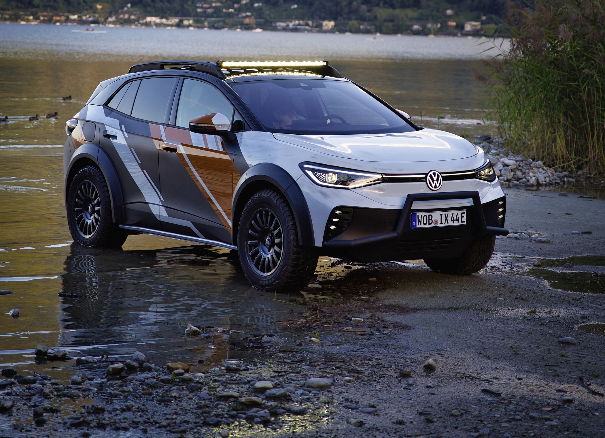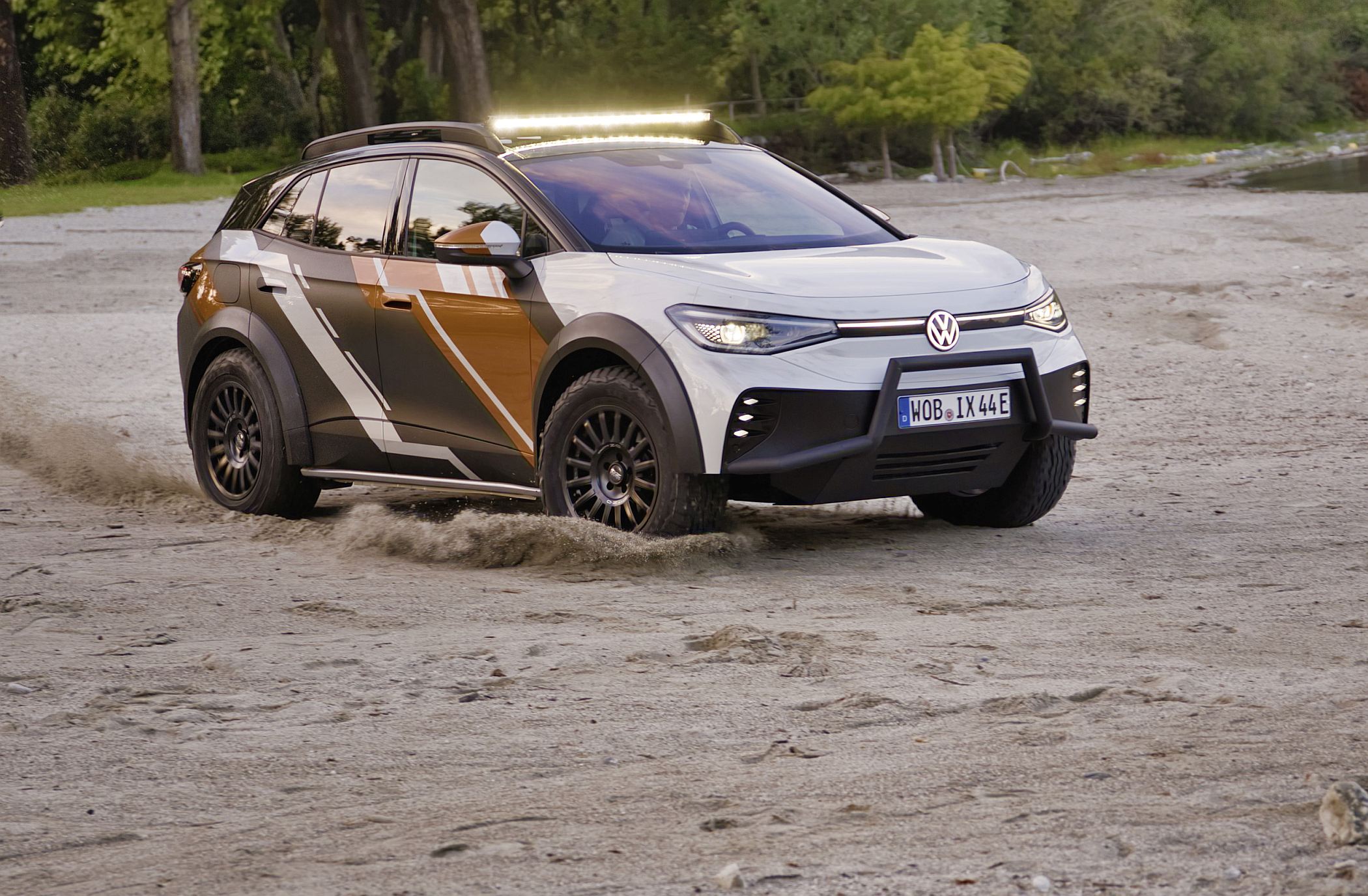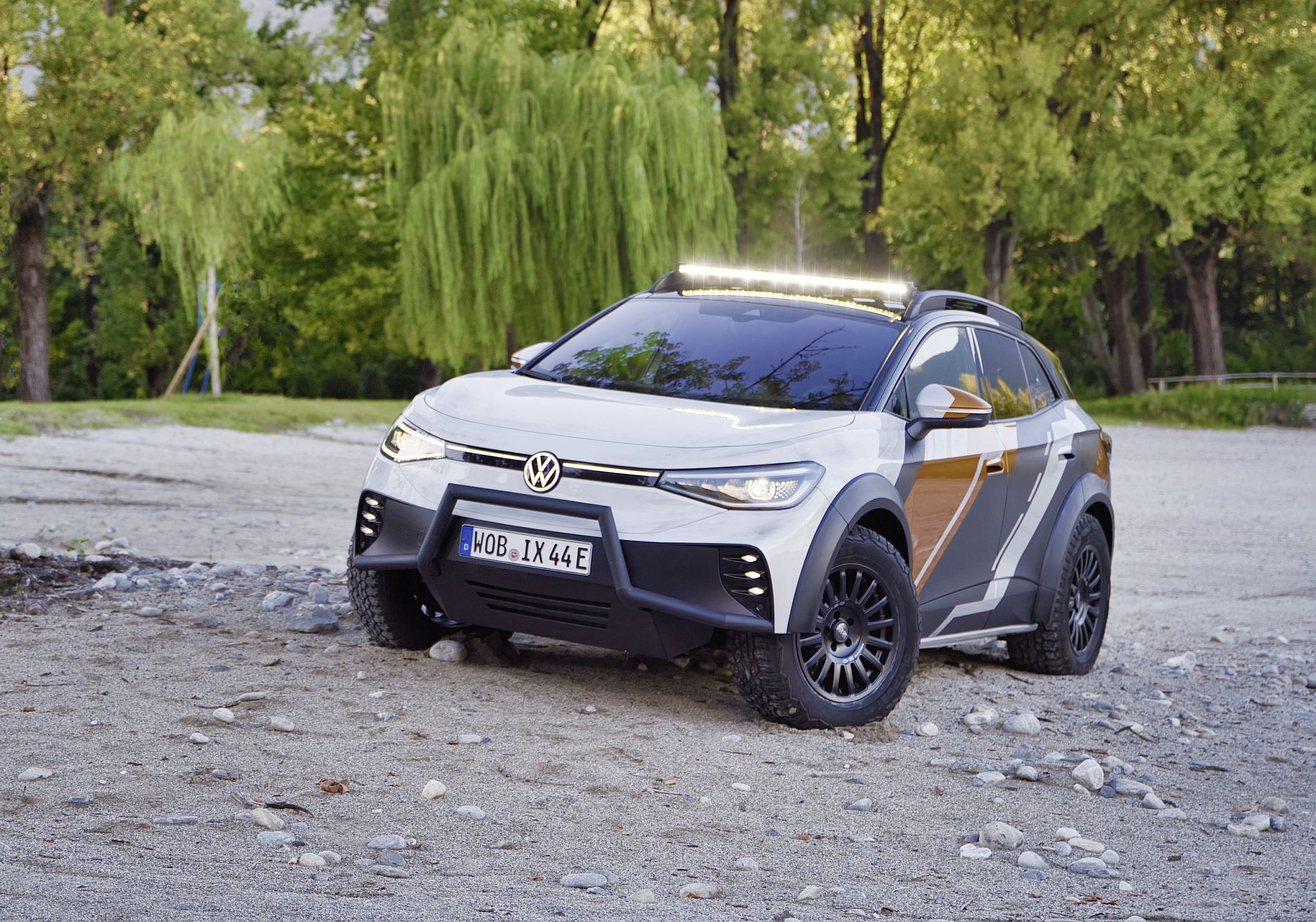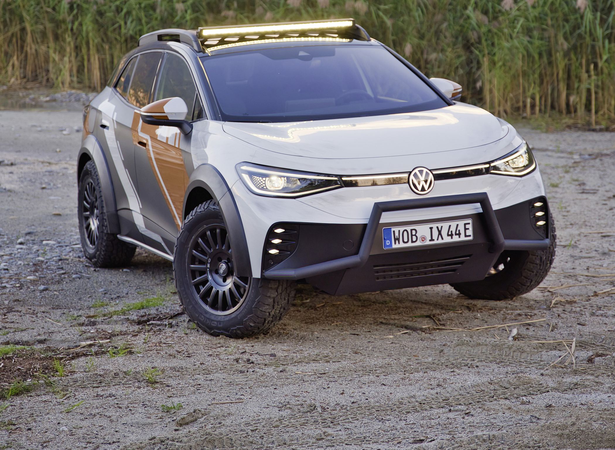 O exterior do ID. XTREME também mostra que o veículo está pronto para qualquer aventura todo-o-terreno. Suspensão de rali elevada, jantes todo-o-terreno de 18 polegadas, elemento de proteção dianteira modificado com um para-choques frontal adicional e alargamentos de guarda-lamas impressos em 3D com mais 50 mm de largura combinam-se para dar ao concept um verdadeiro visual todo-o-terreno. O suporte de tejadilho com luzes LED extra e a parte inferior da carroçaria completamente fechada em alumínio também fazem parte do veículo totalmente elétrico com tração às quatro rodas para viagens fora das estradas pavimentadas.
