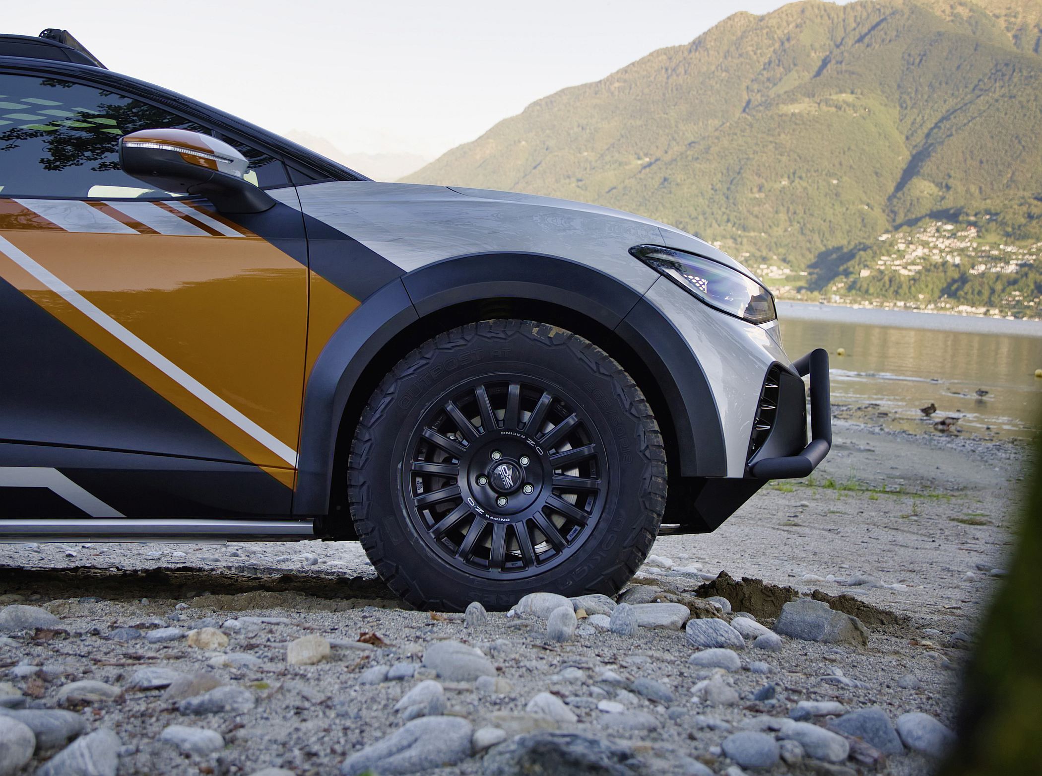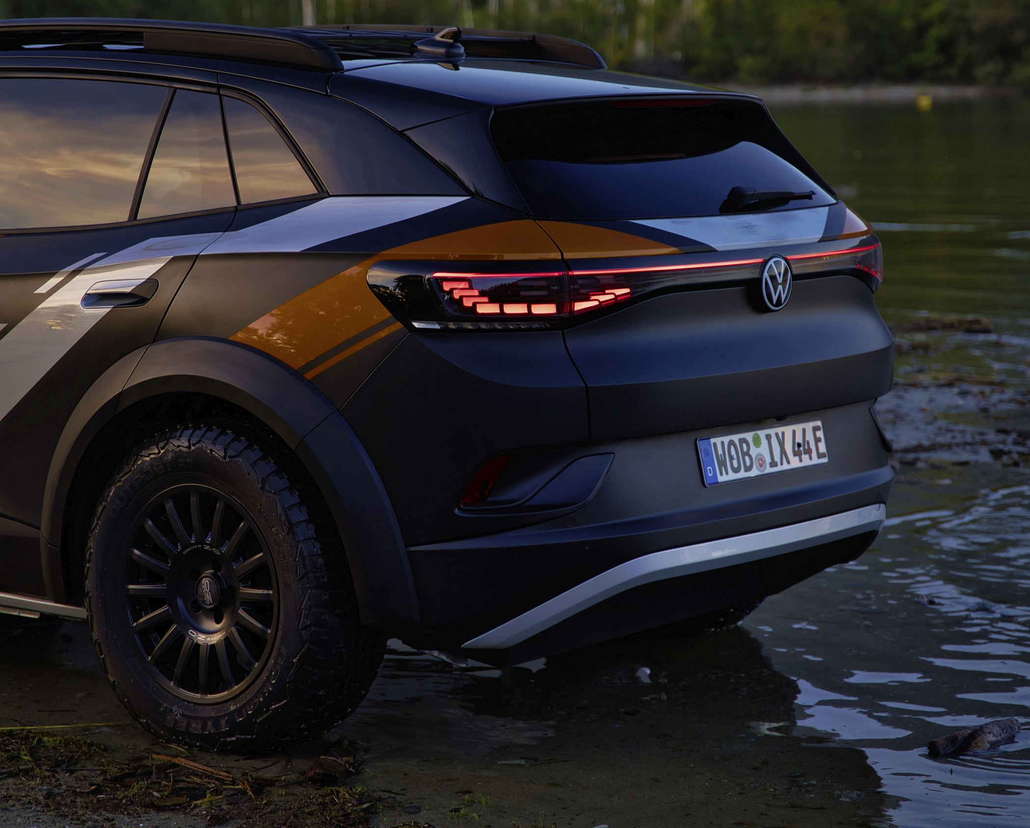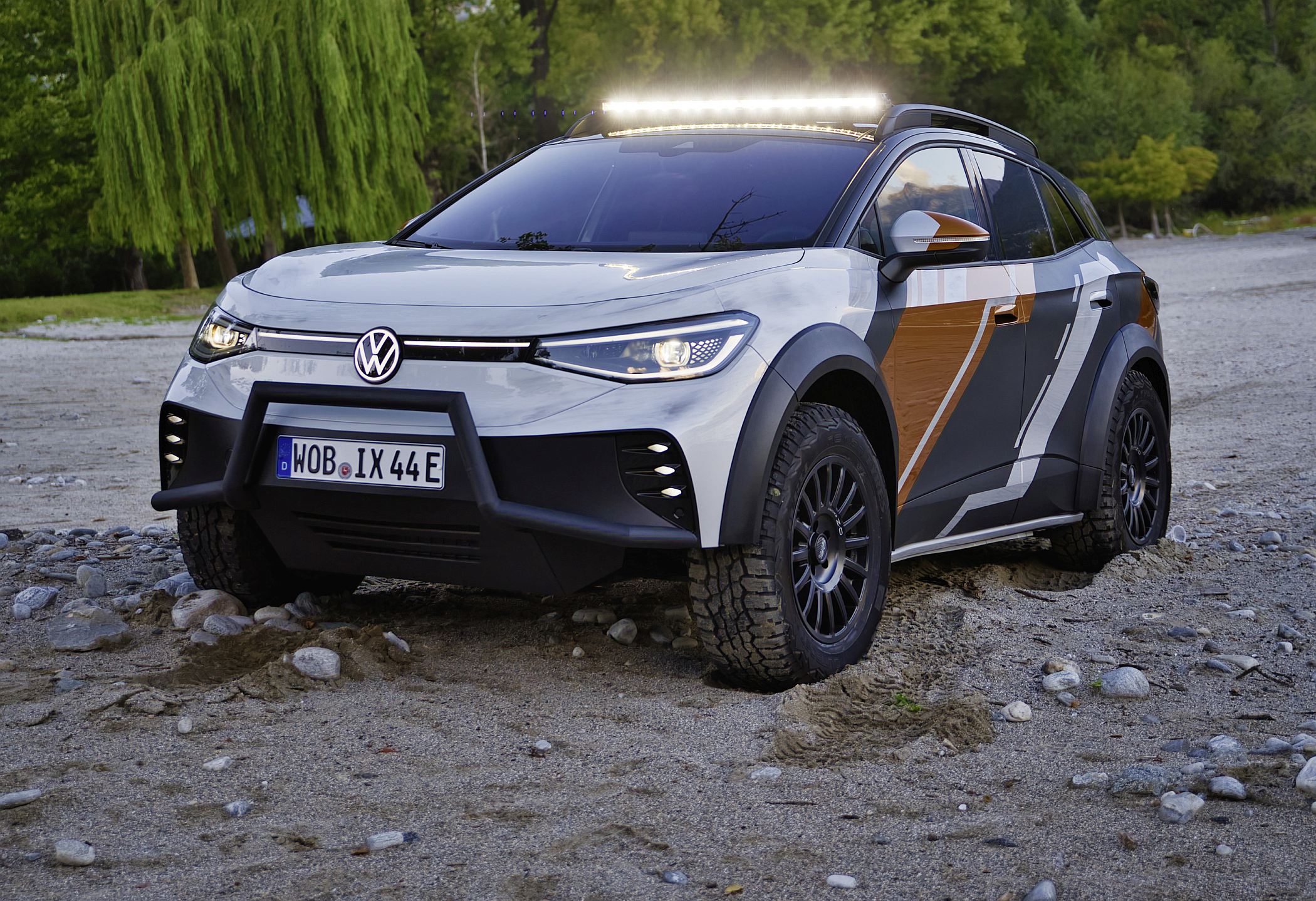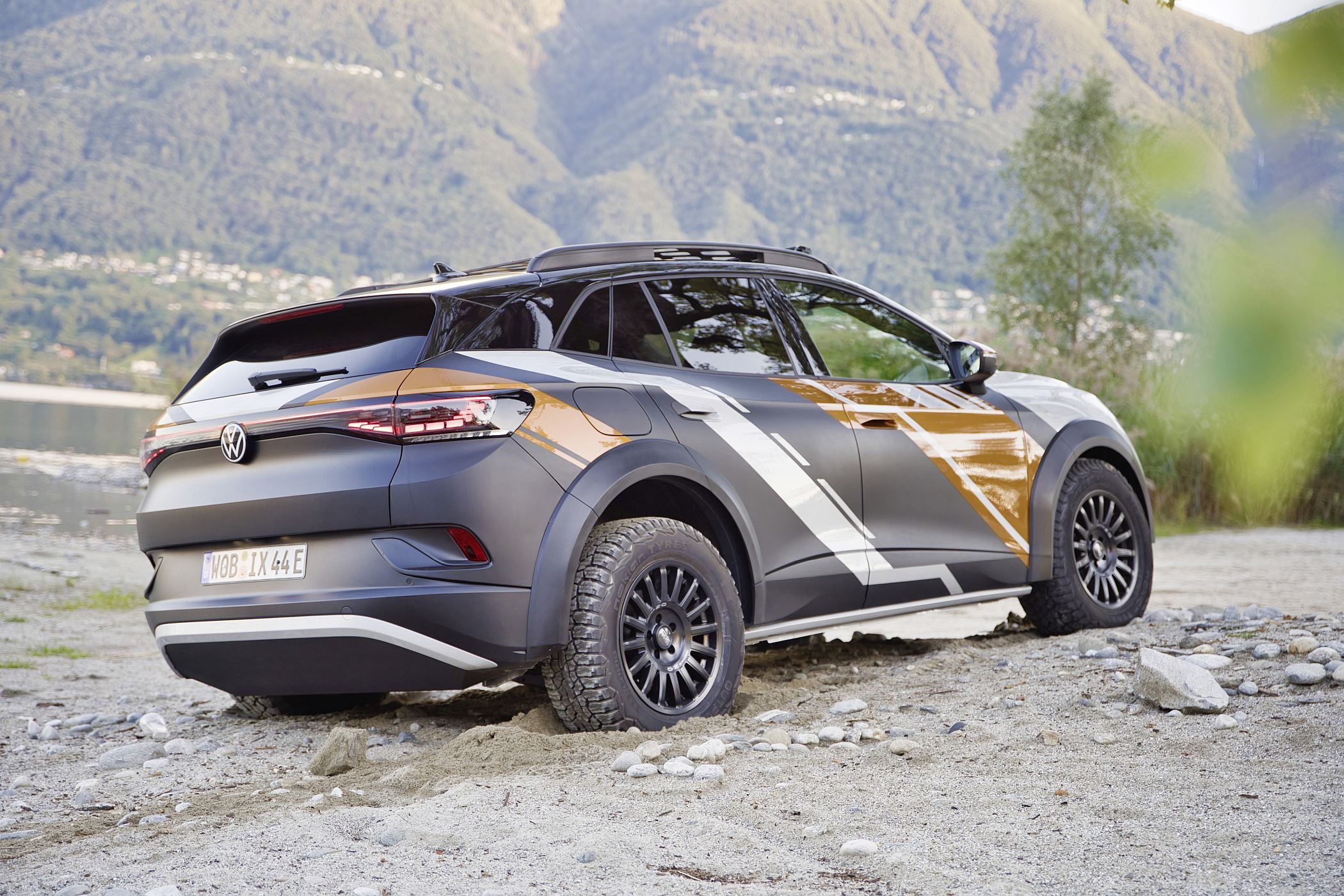 O exterior do ID. XTREME também mostra que o veículo está pronto para qualquer aventura todo-o-terreno. Suspensão de rali elevada, jantes todo-o-terreno de 18 polegadas, elemento de proteção dianteira modificado com um para-choques frontal adicional e alargamentos de guarda-lamas impressos em 3D com mais 50 mm de largura combinam-se para dar ao concept um verdadeiro visual todo-o-terreno. O suporte de tejadilho com luzes LED extra e a parte inferior da carroçaria completamente fechada em alumínio também fazem parte do veículo totalmente elétrico com tração às quatro rodas para viagens fora das estradas pavimentadas.
